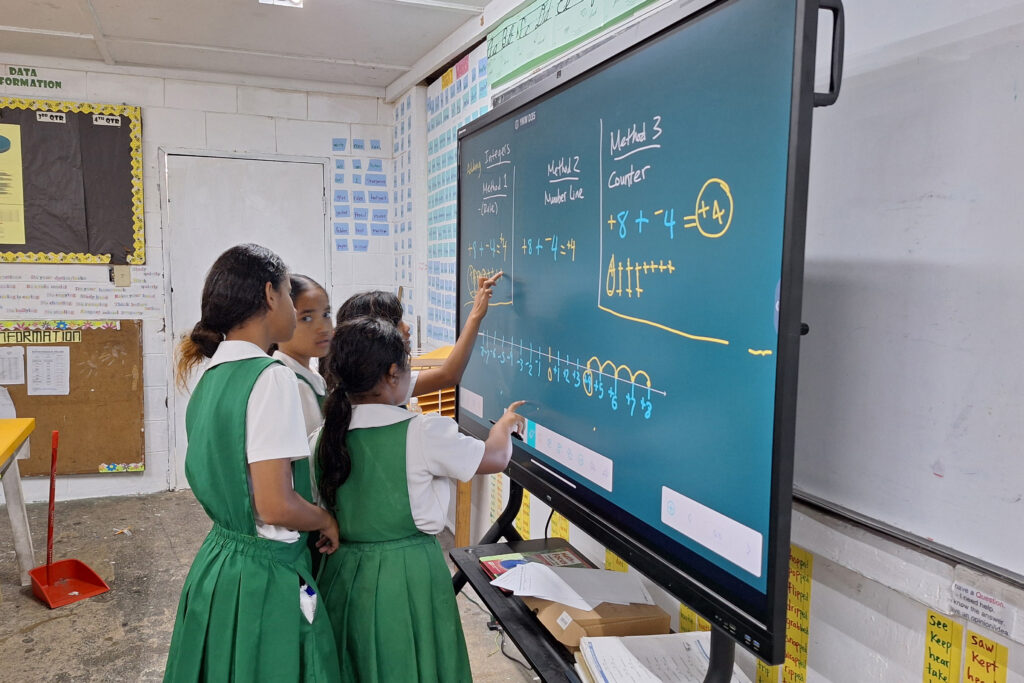 ローラ小学校では3年生のクラスに設置していて、その教室での授業はすべて「ミライタッチ」を活用して行われています。